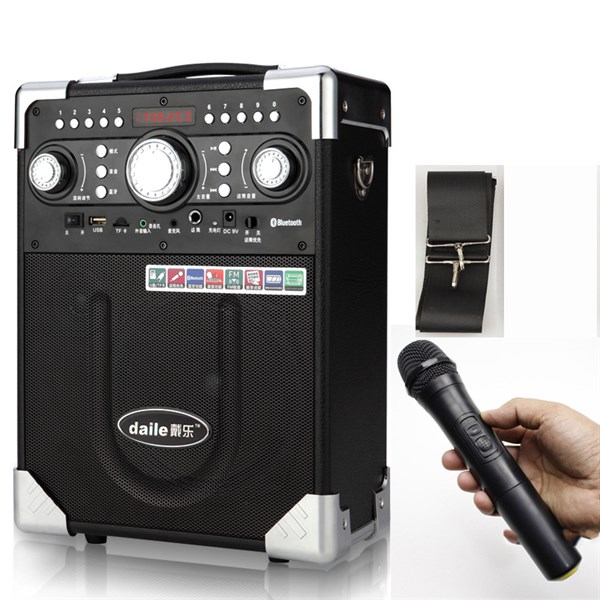 - Loa daile S8 được thiết kế dạng hình hộp chữ nhật với kích thước loa bass 6.5 inch ( bass 2 tấc ). Loa mini có tay xách có thể mang theo đi du lịch hoặc bỏ trong xe ô tô, vali khi đi du lịch. - Với thân loa hình hộp chữ nhật, các góc đều được niền bằng nẹp kim loại. Bên ngoài phủ một lớp sơn màu đen sang trọng. - Các chức năng của loa thì được bố trí ở mặt trước, phần trên loa và được phân thành từng chức năng riêng biệt. Phần trên cùng là màn hình led và các nút được đánh số để chọn bài hát theo ý thích. Phần bên dưới là các nút chỉnh âm lượng loa và micro và các nút tua tới lui, play/ pause. Cuối cùng là các cổng cắm điện, các cổng cắm USB và SD, cổng Aux để nhận âm thanh từ các thiết bị qua kết nối dây cáp, cổng cắm microphone, công tắc nguồn ... - Sử dụng âm thanh nổi digital stereo, công suất lớn nên loa có thể sử dụng tốt ở bên ngoài trời. Ngoài tay xách ra thì loa còn có thể 2 móc kim loại ở bên hông loa để móc dây đeo vai. Vì vậy nếu dùng trong những chuyến đi chơi thì cũng rất rảnh tay và thoải mái lắm nhé! - Tặng kèm micro không dây chất lượng.