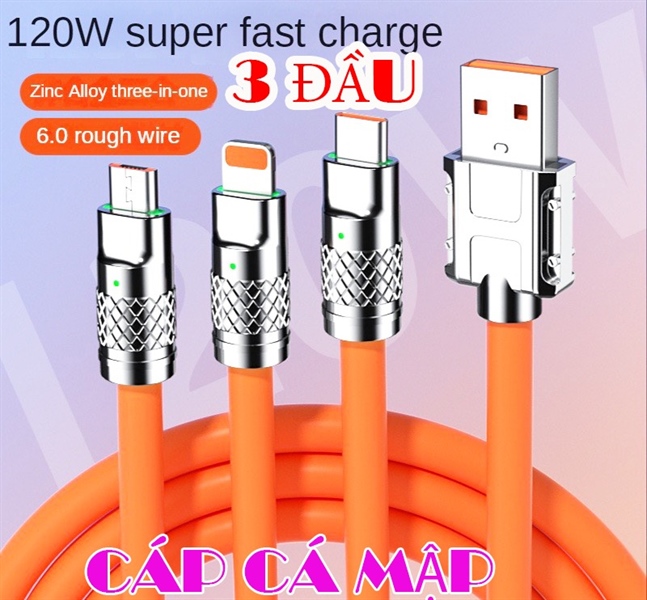 Cáp sạc nhanh 3 đầu Cá mập dài 1m